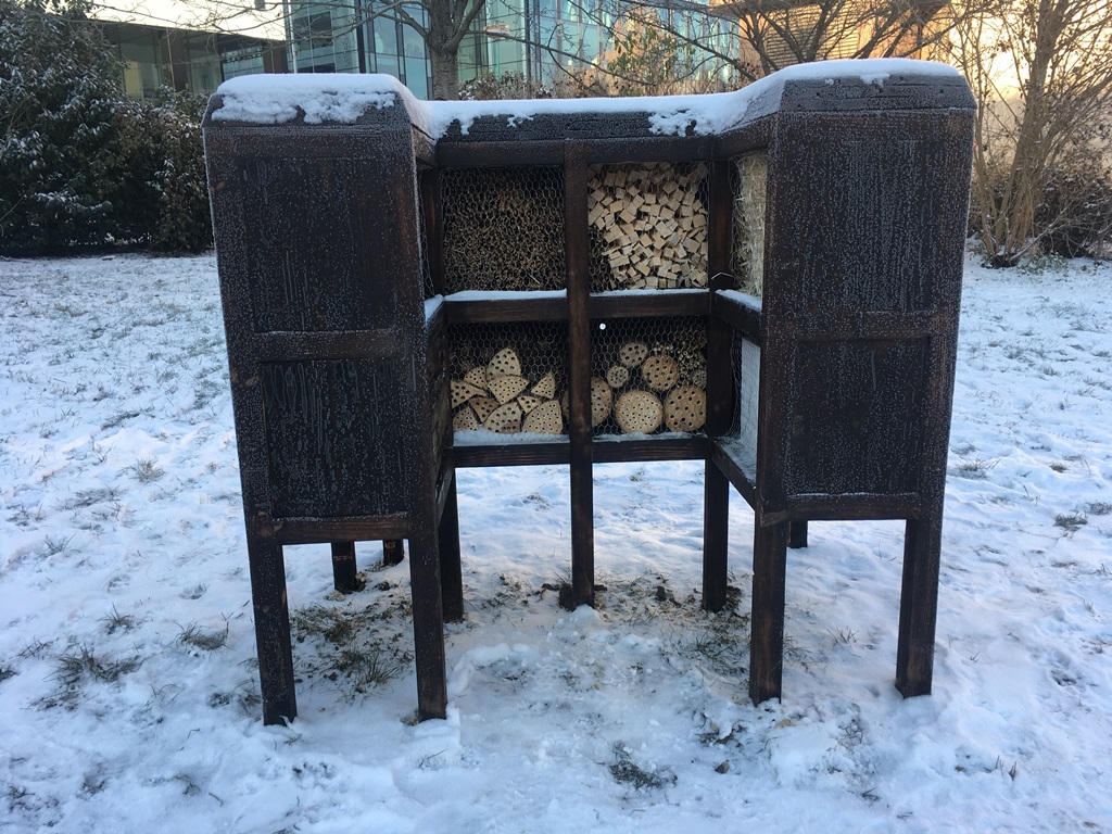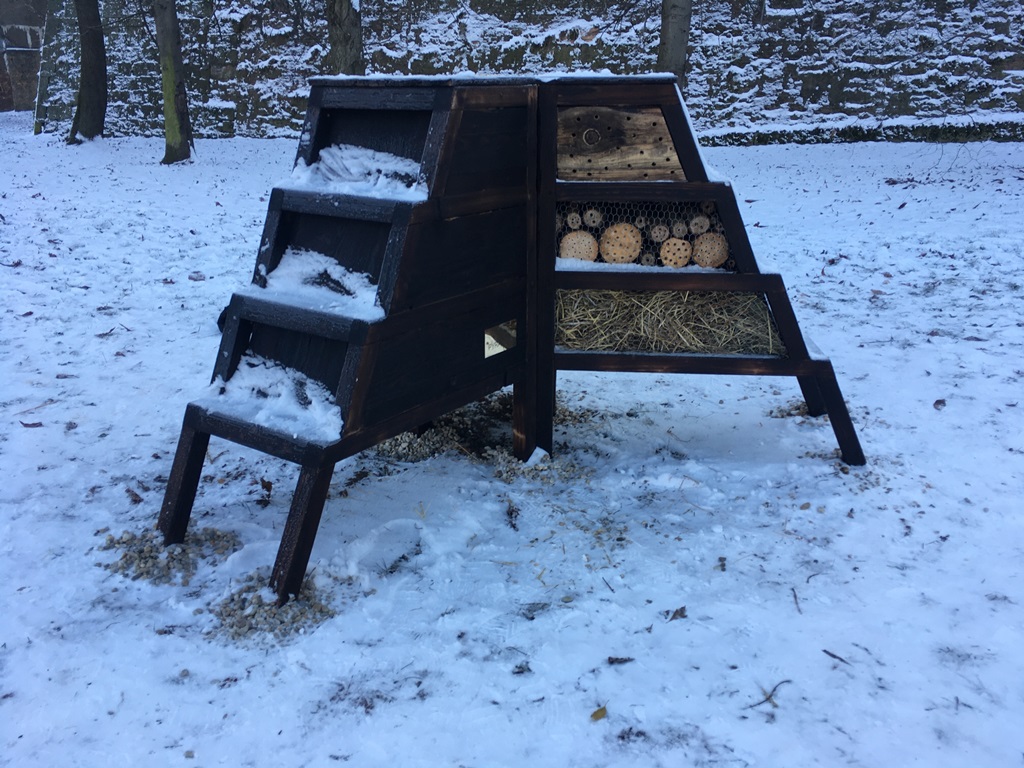 • Dřevěné části hotelu jsou ošetřené co nejšetrněji pouze přírodnímy materiály tak, aby neodpuzovali citlivé hosty. Počítáme s využitím opalovaného dřeva na zastřešení. • Stavba samotná dosahuje výšky 3 metrů, obytné prostory začínají ne níže než jeden metr nad zemí s ohledem na hmyzí preference. • Obytné části jsou chráněny jemným pletivem před nevítanou ptačí návštěvou. • Vnitřek hotelu je zpracován z přírodních materiálů v souladu s potřebami a náročnými požadavky hmyzích návštěvníků (potencionálním obyvatelům se nelíbí jen tak někde, např. se nesmí využívat syntetických laků, otvory pro hmyz musí mít správnou velikost a hloubku..apod.). • Konstrukce je uzpůsobena k snadné ůdržbě a renovaci dřevěných částí podléhajícím povětrnostním podmínkám. • Jako zkušení designéři jsme schopni ve spolupráci s truhlářem zajistit celou výrobu objektů sami, při dodržení zákonitostí nezbytných pro správnou funkci hmyzího hotelu (realizaci samotnou bychom konzultovali s entomologem). • podpora hmyzích úkrytů, slouží především samotářským druhům • podpora opylovačů rostlin, kterých je výrazný úbytek • podpora biodiverzity a ochrana přírody • možnost sledování způsobu života samotářského hmyzu
