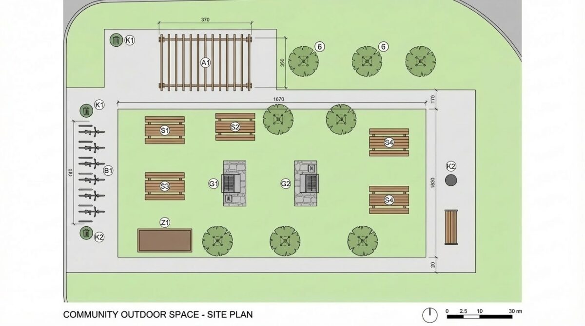 Pikniková a grilovací zóna – instalujeme kvalitní lavičky, stoly a grilovací ohniště, vysadíme několik stromů pro stín a zřídíme malou bylinkovou zahrádku. Prostor bude celoročně k dispozici pro rodinné pikniky, sousedská setkání i sportovní aktivity.