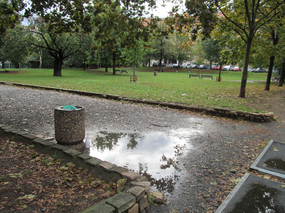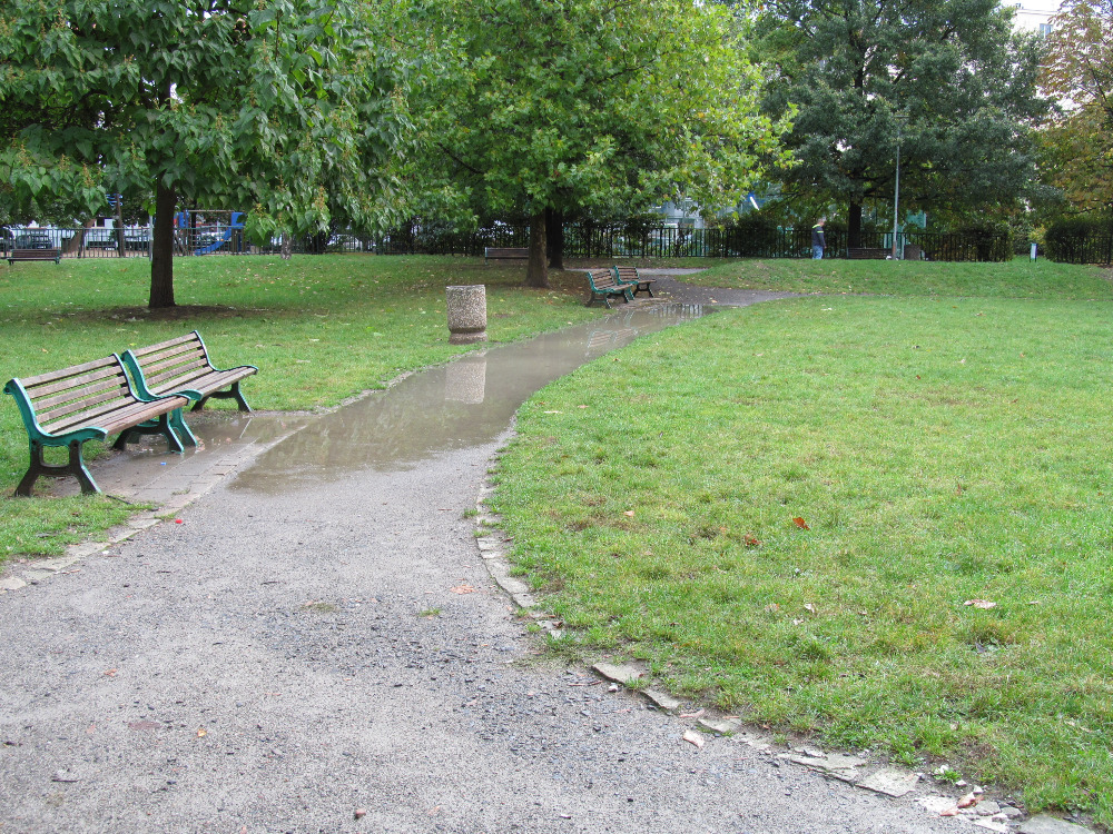 3. Zcela zásadní je vybudování resp. generální oprava cestiček uvnitř parku kolem travnatého oválu. Stávající cestičky se po dešti mění v dlouhotrvající soustavu louží a jsou až neprůchodné. Je nutné odvodnění (drenáž) a povrch cestiček by měl být mlatový či dlážděný s jasně vyznačenou pevnou obrubou ohraničující rozhraní cestiček a trávníku.