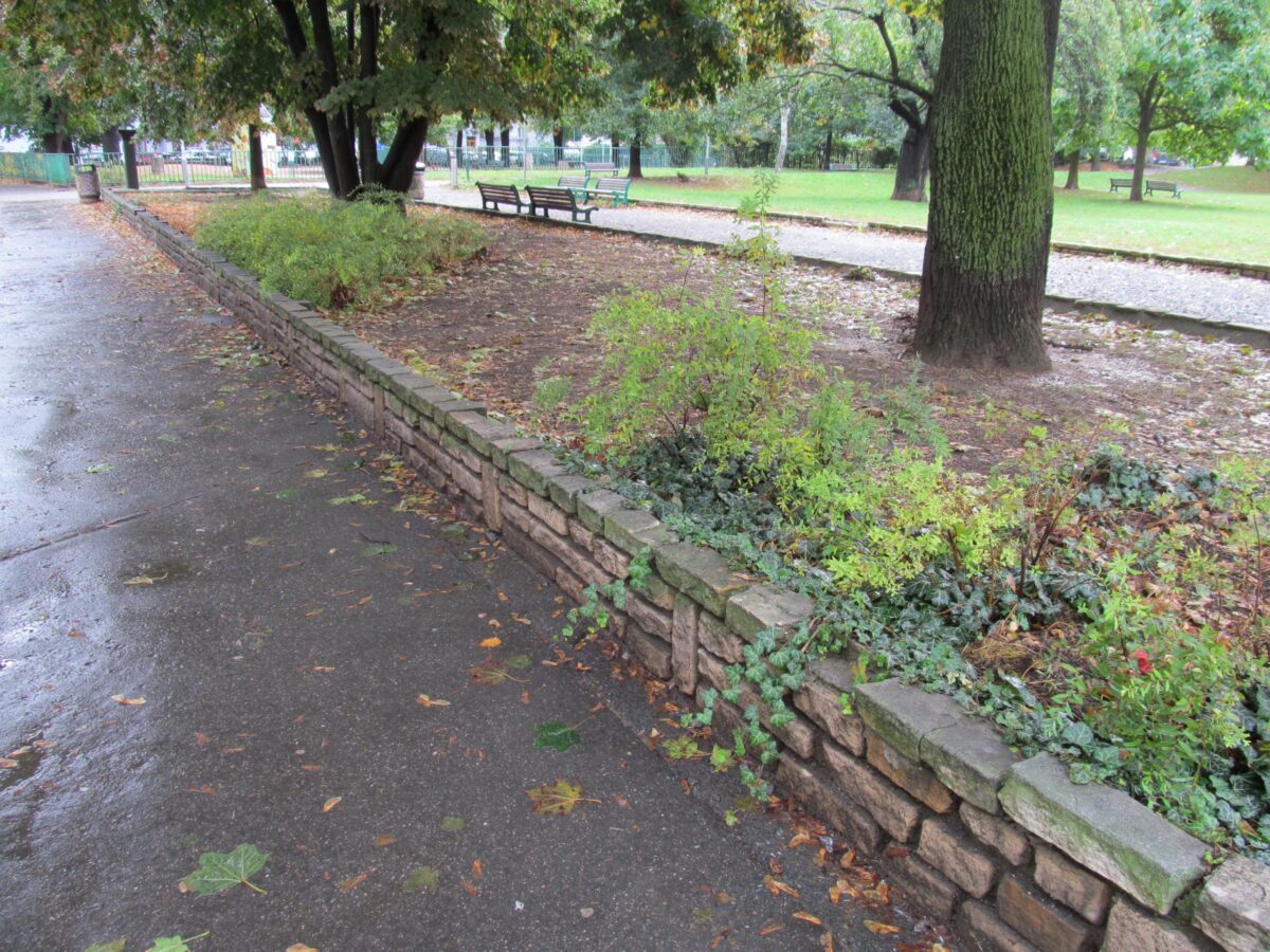 2. Znovu obnovit pás keřů (nejlépe kvetoucí nízké dřeviny – např. forzýtie, čilimník, apod.) na straně k Lotyšské ulici, aby byl park aspoň částečně odstíněn od provozu v ulici Lotyšská. Z původního pásu keřů zůstaly jen žalostné zbytky. Dále by také bylo vhodné přidání dalších pásů nízkých dřevin po obvodu parku.