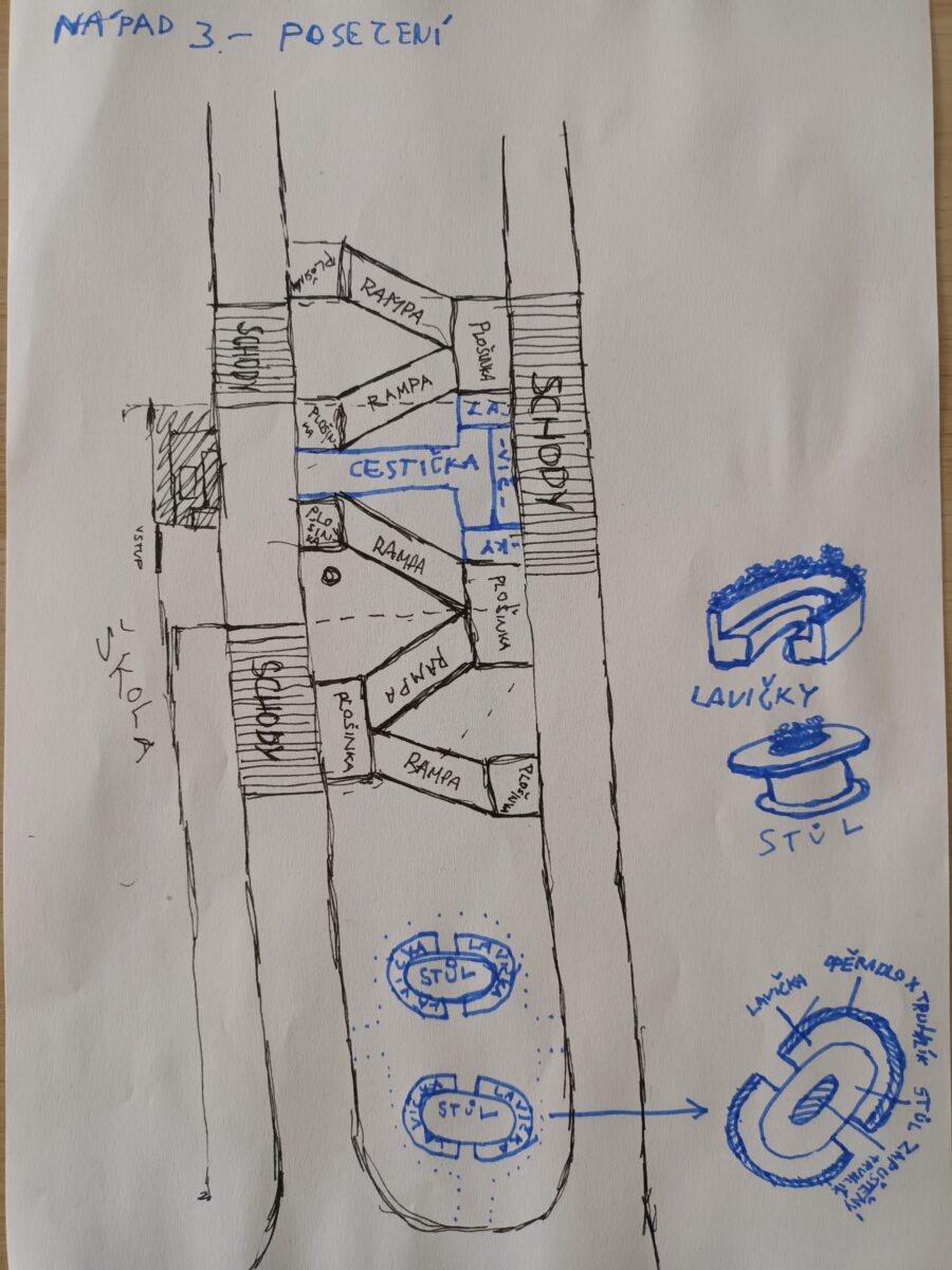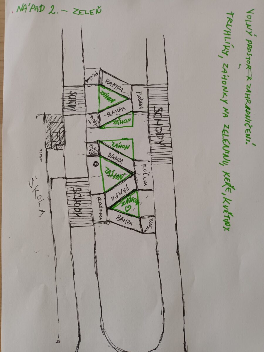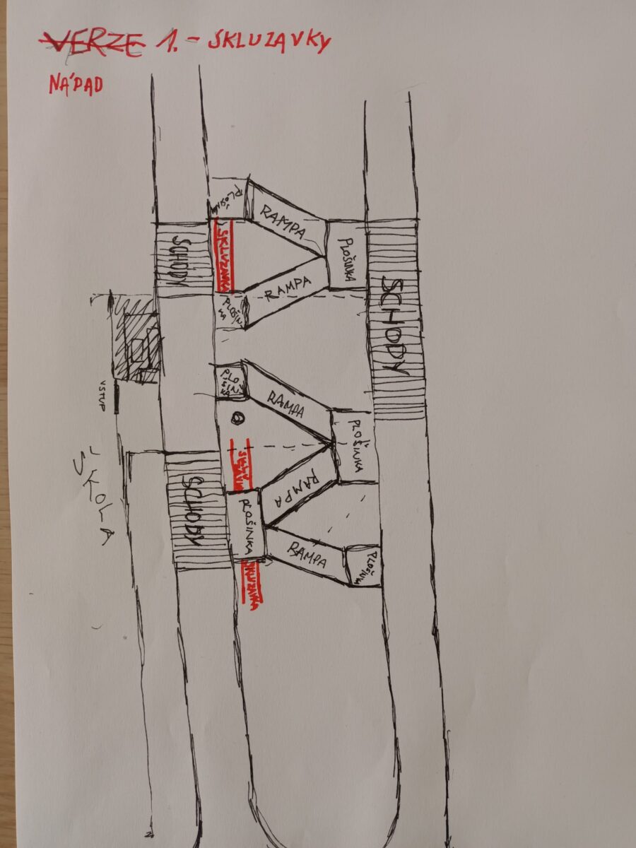 Náš návrh by toto měl vyřešit – přinést bezbariérovost a navíc využít pozemek k naplnění funkce veřejného prostoru – rozšířeného náměstí pro setkávání lidí s možností sednout si na lavičce, případnému přidání herních prvků (například skluzavek či malého pískoviště). V našich návrzích je uvedené aplikováno ve verzích: