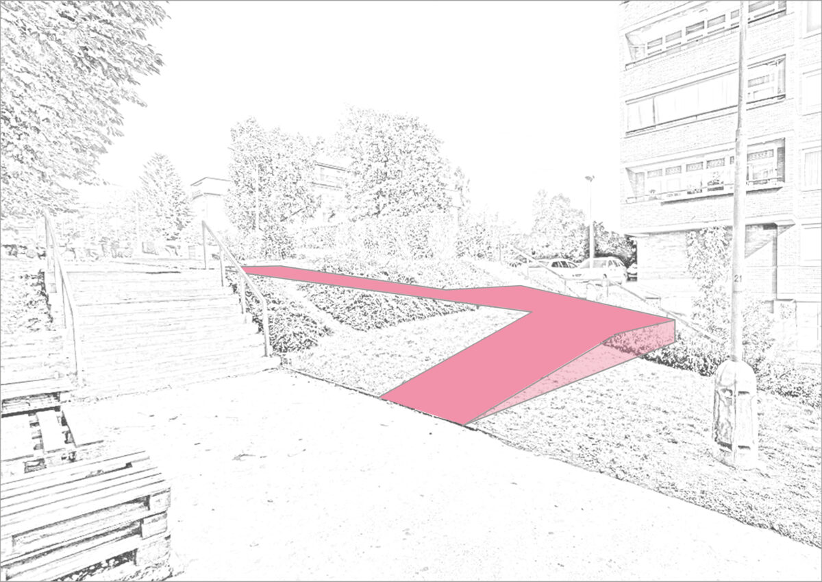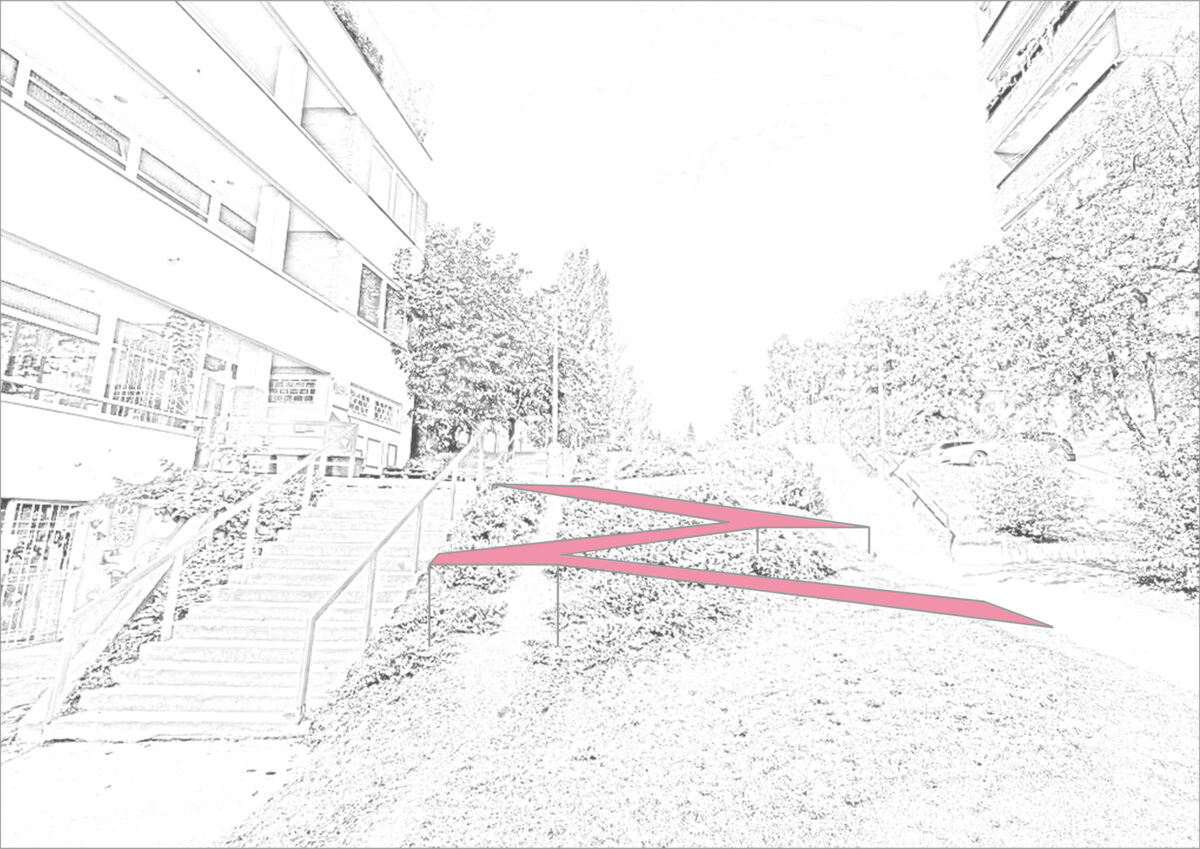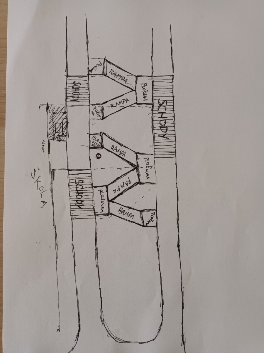 Náš návrh by toto měl vyřešit – přinést bezbariérovost a navíc využít pozemek k naplnění funkce veřejného prostoru – rozšířeného náměstí pro setkávání lidí s možností sednout si na lavičce, případnému přidání herních prvků (například skluzavek či malého pískoviště). V našich návrzích je uvedené aplikováno ve verzích: