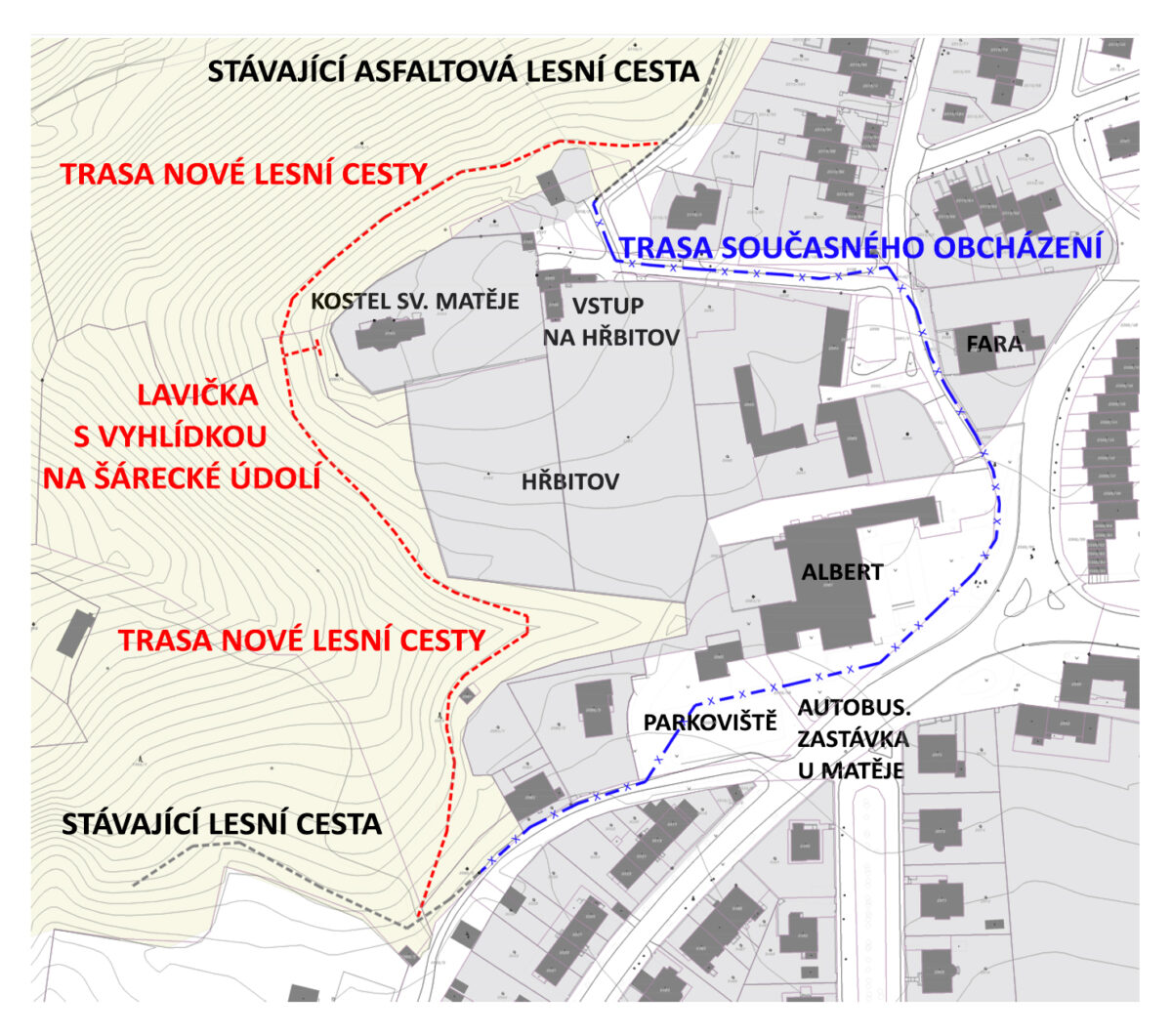 Lesní cesta / pešina od dětských hřišť v ul. Soborská až ke zřícenině Baba tvoří významnou rekreační trasu uceleného charakteru. Ten je přerušen v jediném místě – v okolí obchodního domu Albert. Zážitek z klidné procházky lesem je narušen nutností překonat cca 500m dlouhý úsek hlučným, prašným, dopravně frekventovaným prostředím, mj. přes parkoviště a podél silnice, než se lze zpět napojit na příjemnou přírodní cestu. Řešení Propojení lesních cest „zadem“, okolo hřbitovní zdi, pod kostelem sv. Matěje. Podmínkou by mělo být navázání na stávající charakter „lesní cesty“. Musí být citlivě zrealizovaná vzhledem k přírodním hodnotám místa, může jemně zdůraznit místo vyhlíkdy, např. lavičkou. Navrhujeme pas / traverz, který vede téměř po vrstevnici, po pozemcích města. Cesta by měla být v duchu celé trasy – pouze základními prostředky zpevněná, povrch udusaná hlína, případně mlat. Významným benefitem propojení by bylo mj. zpřístupnění mimořádné vyhlídky na Šárecké údolí od paty kostela. (nyní je pro tuto vyhlídku potřeba vstupovat na hřbitov a prosmýknout se mezi hroby ke zdi.) Přesné trasování nové cesty by bylo určeno na základě podrobného geodetického zaměření lokality a porovnání variant (viz příloha). Jedná se o pozemky města. Propojení lesních cest podle našeho názoru ocení všichni – výletníci, rodiny s dětmi, běžci, pejskaři i místní obyvatelé. (pozn. Žádoucí investicí by byla celková kultivace prostoru před supermarketem Albert, to je však mimo finanční rámec této akce.)