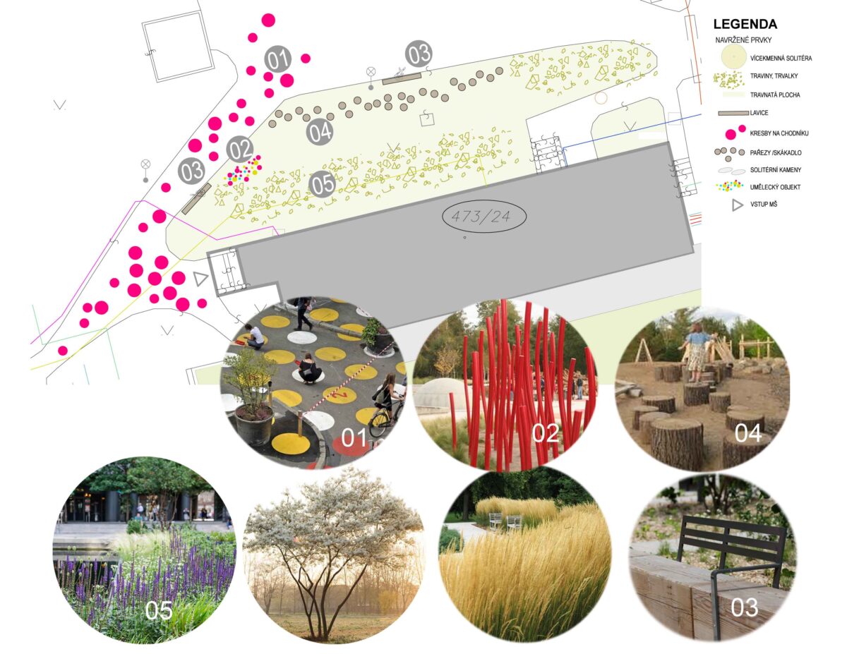 • doplnění pobytových prvků (grafika- hra na chodníku, lavice, přírodní herní prvek, umělecký objekt, zeleň)