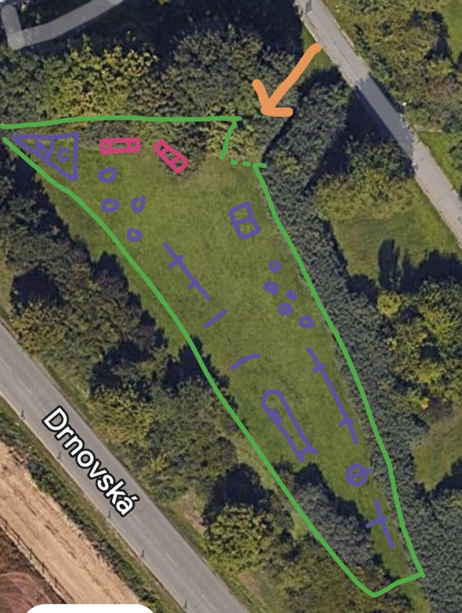 Nyní je to místo, na valu, který Dědinu odhlučňuje od Drnovské, existuje na něj vstup/vjezd, je to rovina na vrchu valu, dokola zarostlá udržovanými křovinami. Jedná se o loučku, která je na severní straně od bytového domu Šmolíkova 13 a 15 oddělená vzrostlými stromy. Při oplocení, brance na místě mohou vzniknout agility prvky pro majitele psů, za plotem, na hezkém a přesto obyvatele Dědiny nerušícím místě