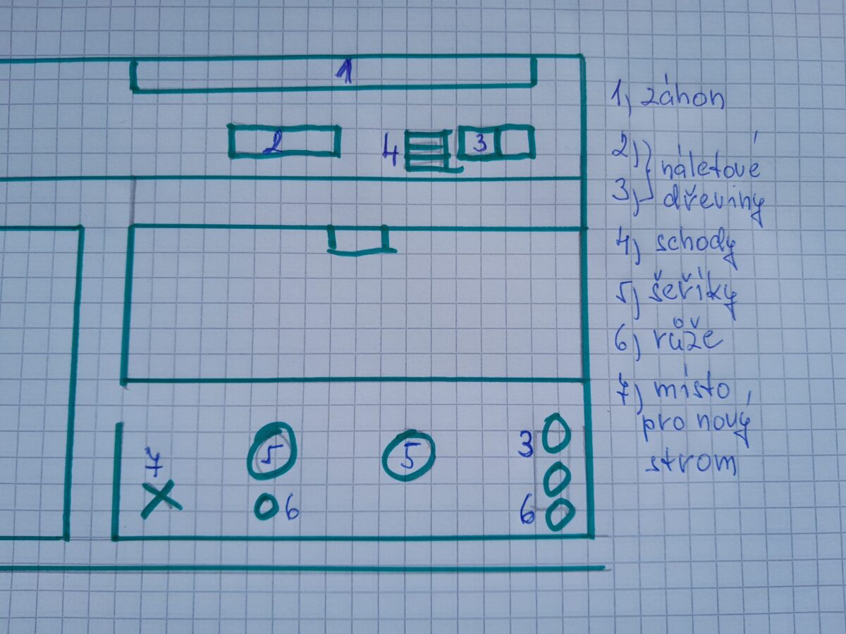1. Podél zdi se táhne bývalý záhon – ten by mohl být osázen nízkými keři, trvalkami nebo okrasnými trávami 2. Pravidelně prořezávat dva velké keře černého bezu. 3. Odstranit náletové dřeviny. 4. U vzrostlých stromů u zdi odstranit suché větve. 5. Opravit schody, které vedou ke šňůrám na prádlo. Plocha před domem 1. Pravidelně prožezávat šeříky – růžový keř pod převislými větvemi skomírá. 2. Podél plotu se sousední zahradou prořezat náletové dřeviny, aby tvořily živý plot a ne džungli. 3. V přední části v pravém rohu při pohledu do ulice vysadit okrasný listnatý strom – před lety se pod tíhou sněhu jeho předchůdce rozlomil a byl proto odstraněn.