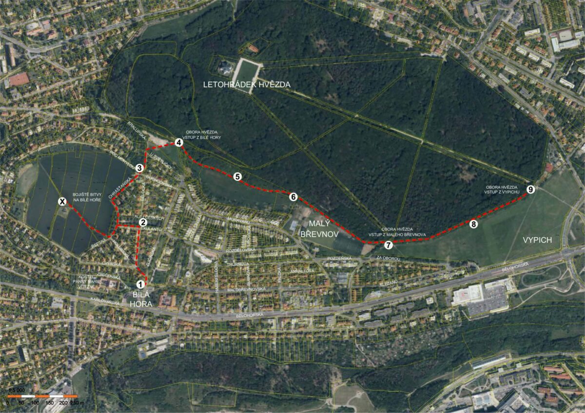 Bitva na Bílé hoře, ke které došlo před 400 lety, je natolik významnou událostí našich dějin, díky čemuž je toto místo hojně navštěvováno. Řada návštěvníků, ať už z řad školních výprav, cizinců či rodin s dětmi, je do značné míry zklamána, neboť v současnosti tuto událost připomíná pouze pole s malou mohylou a jednou menší informační tabulí. Kdo to v okolí nezná, neví co dál dělat, kam jít. Navíc, jak vyplývá z článku „Kde leží kosti z Bílé hory“, uveřejněného v Hospodářských novinách dne 23. 10. 2020, tak ani řada místních obyvatel neví, o co přesně v bitvě šlo, tedy kdo s kým, proti komu a proč. Vytvořením informační naučné stezky, která by byla určena pro všechny věkové kategorie, by došlo nejen k předání informace, ale i díky současným technickým možnostem k zprostředkování určitého zážitku – a to přímo na místě, kde se vše odehrávalo. Bílá hora je naprosto jedinečné místo, nejen z historického pohledu jedné z nejvýznamnějších bitev na našem území, ale navíc je celý prostor zasazen v zeleni, a zasloužil by si tedy naznačený volný průchod od památníku mohyly až po oboru Hvězda a podél její obvodové zdi – v místech, kde bitva probíhala. Díky letošnímu 400. letému výročí proběhla v rámci oslav řada akcí, z nichž většina byla jednorázová. V Aleji českých exulantů na Bílé hoře byl v den 400. letého výročí (8. listopadu) vztyčen Kříž smíření. Napsáno bylo i několik článků a zamyšlení nejen k historické události samotné, ale i k současnému stavu místa: o chybějící naučné stezce s informacemi, jež by daly místu důstojnost a veřejnosti poučení, se zmiňuje ve svém článku „Co s Bílou horou“ v Respektu ze dne 1. 11. 2020 Marek Švehla. Z těch trvalejších aktivit uskutečněných k výročí se jedná zejména o dodatkové tabule k názvům ulic spojených s bitvou na Bílé hoře, nebo vytvoření digitální procházky bojištěm v aplikaci Prague Histories, která v sobě obsahuje řadu audiovizuálních prvků – což by bylo skvělé propojit s námi navrhovanou Stezkou, a rozšířit tak fyzicky zbudovaná zastavení o další rozměr. Podoba stezky Stezka by měla mít podobu informačních tabulí (cca 8 – 10 zastavení), které budou umístěny s určitými rozestupy, a to zejména na významných místech (mapka s nákresem viz výše), tak aby bylo možné dojít od zastávky Bílá Hora na zastávku Vypich s možností využití MHD (tram, bus). Všechny pozemky, které jsou vytipovány, jsou v majetku hl. m. Prahy na území městské části Praha 6 a část z nich přímo ve správě městské části Praha 6. Protože Stezka je naplánovaná v těsném sousedství národní kulturní památky (v ochranném pásmu) a kouskem zasahuje i do NKP Bojiště bitvy na Bílé hoře s mohylou a oborou Hvězda s letohrádkem, byl celý nápad konzultován na Národním památkovém ústavu (dne 25. 11. 2020). Nápad Stezky byl přijat pozitivně, důležité v případě realizace je dodržet základní pravidla: jednotné estetické a grafické ztvárnění celé Stezky; podpora byla i u námi navrhovaného použitého materiálu (dřevo a corten); dále požadavek na zachování průhledů, respektování konkrétního umístění a průběžná konzultace s NPÚ. Doporučená byla také podoba mírně nakloněných info-tabulí, které jsou přívětivější pro čtenáře. Velmi zajímavá by byla možnost přidat do této Stezky i již existující zastavení u mohyly (v minulých ročnících bylo zakázáno tyto pozemky do Nápadu navrhovat), aby získala info-tabule shodný design a doplnit o dalekohled, kterým by bylo vidět nejen detailněji bojiště, ale i pamětnou horu Říp – čímž by se ještě více využil reliéf Bílé hory, jakožto hory stoupající nad okolní krajinu a historický význam obou „na sebe hledících hor“. Forma informačních tabulí by byla přírodní, avšak vhodná do městského prostředí, tj. nikoli rustikální dřevěné provedení. Z tohoto důvodu navrhujeme COR-TEN (případně ve spojení se dřevem), použitého na informační tabule v oboře Hvězda (COR-TEN je ocel s vysokou odolností proti korozi, a to bez povrchové úpravy. Chrání se sama vrstvou patiny, která je zároveň vizuálně výjimečná, nenapodobitelná a zcela bezúdržbová. Vzhledem k tomu, že na povrch COR-TENu není třeba použití žádných nátěrových hmot a zároveň je zcela recyklovatelný, jedná se o ekologický materiál šetrný k životnímu prostředí.). Krom použitého materiálu si lze zajímavě pohrát i s podobou, ať už využijeme klasickou horizontální, vertikální podobu nebo více moderní spojení s informacemi poskytnutými formou tisku či vlysu na asfaltové cestě. Každé stanoviště má svůj specifický charakter, který bychom rádi respektovali, a to i v podobě „informační tabule“. V žádném případě nechceme narušovat vzhled okolí či úžasné průhledy – pouze je obohatit a poukázat na jejich význam. Naším favoritem je spojení souboru dvou zalomených cortenových tabulí, příp. v kombinaci se dřevem s ohledem na aplikované herní prvky (podrobněji viz níže). Podoba nakloněné tabule je vhodnější pro čtení než svisle umístěný text a její výška nebrání ve výhledu do okolí. Tato podoba byla také doporučena při konzultaci na Národním památkovém ústavu. Jedná se o variabilní podobu informačních tabulí, je možné použití v rozdílné šířce dle rozsahu textu a grafiky v konkrétním místě, a také by bylo možné využít rozdílnou výšku pro děti x dospělé. Po obsahové stránce by bylo vhodné rozdělit každou informační tabuli na část určenou pro širokou dospělou veřejnost (obecné historické informace, spolu s n